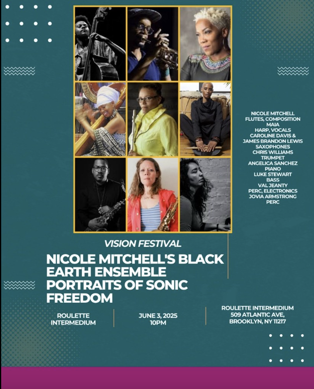Nicole Mitchell’s BLACK EARTH ENSEMBLE (BEE) is a musical celebration of the African American cultural legacy and Black experimental art. Founded and directed in 1998 by creative flutist/composer Nicole Mitchell, BEE has performed in festivals and art venues throughout Europe, the U.S., and in South Africa. BEE’s music embraces the ancient past and paints visions of a positive future. The music is the weaving of swing, blues, avante-garde jazz, bebop, African rhythms, Eastern modes and Western classical sounds. The name “Black Earth” was chosen to honor the feminine source that our lives depend on—Mother Earth and humanity’s mother—Mama Afrika. The purpose of Black Earth Ensemble is to inspire the human spirit with thought-provoking beauty while in conversation with the challenges of today’s world. As a woman-directed, co-ed, multi-generational group, it touches a range of energetic spaces rarely expressed in a “jazz” setting. Black Earth's message is intended for audiences of all ages and backgrounds.